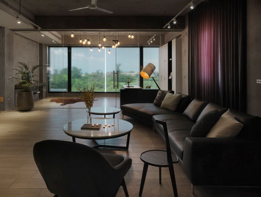 На первом уровне квартиры расположились гостиная, кухня, кабинет хозяина