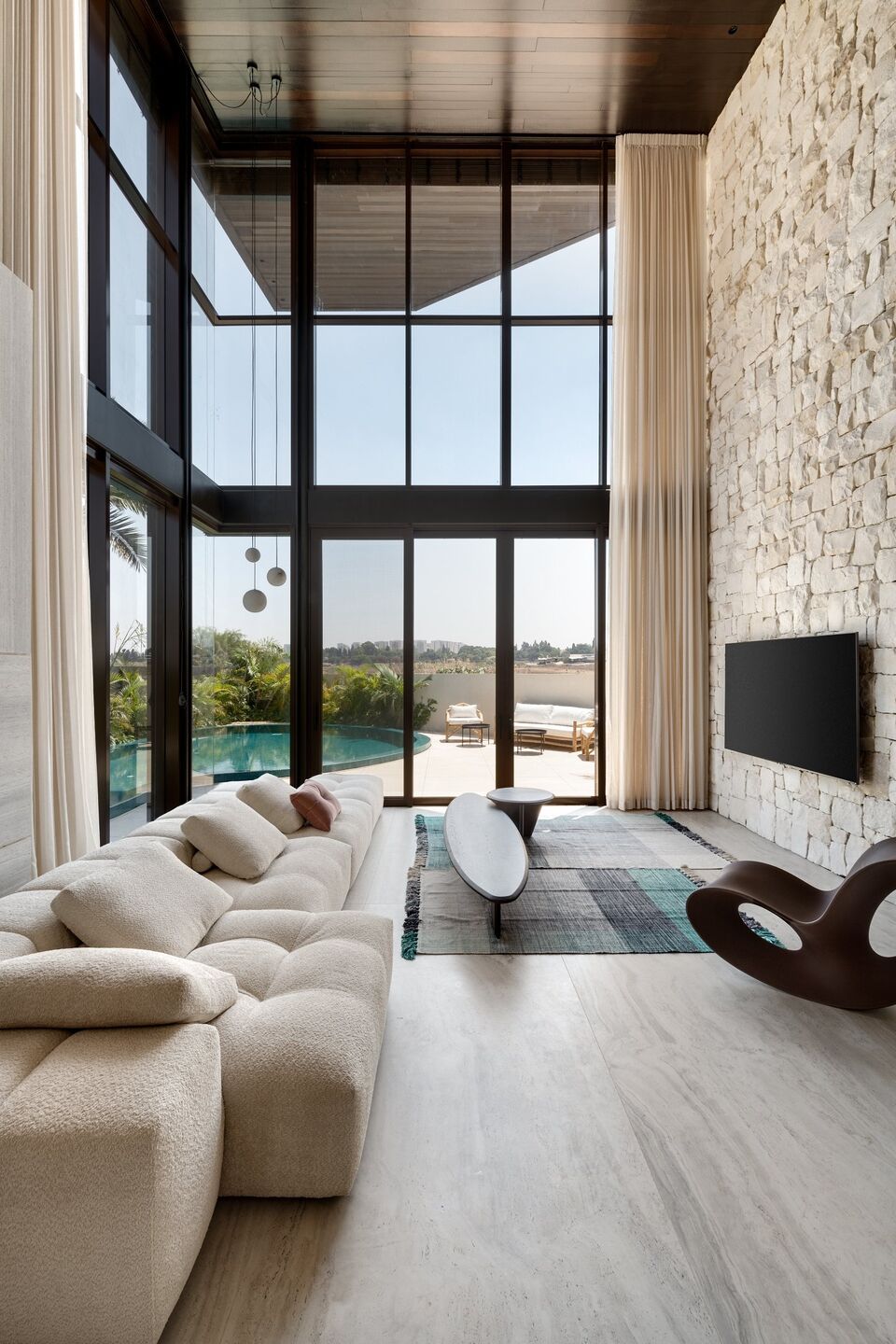 The geometric architecture, sculpted spaces, and use of refined materials in shades of sand, earth, and stone, drench the home with a sense of calm and warmth. The neutral shades throughout set the stage for a beautiful play of light and shadow. It took two months to develop the project concept. The irregular shape of the plot posed a challenge to the planning process, the plot is trapeze-shaped, with a narrow facade and rear that is three times wider, after studding the plot in depth, we created sketches, and the optimal way forward was to create a structure that was abundant in folds that gradually open up in a harmonious flow, without being obvious to the eye, The front facade is narrow and one-dimensional and unfolds as one moves further along the property, to reveal additional space and dimension.