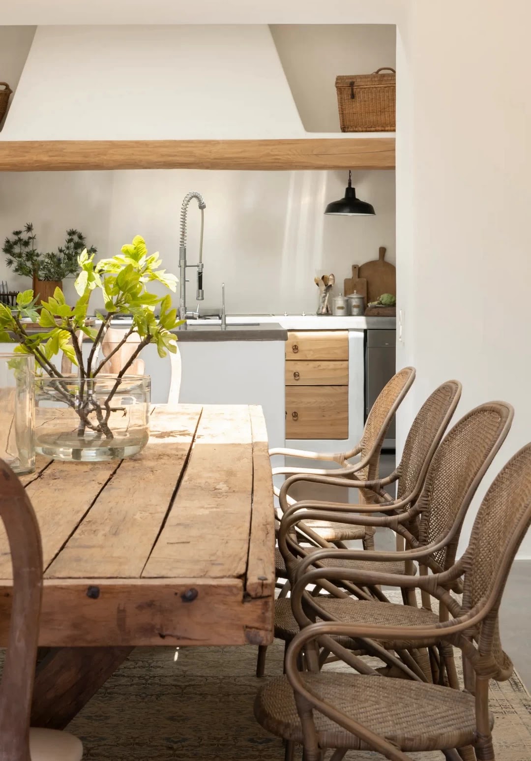 This elegant living room in Ibiza, designed by Azul Tierra interior design studio, stands out for its unique pieces of furniture. The rustic wooden beamed ceiling adds a warm and cosy touch to the space. A majestic crystal chandelier hangs from the ceiling, illuminating the area with a soft glow. The sturdy wooden table next to the white linen sofa and the antique gilded corbels on the wall bring a mix of styles that create a sophisticated and eclectic ambience.